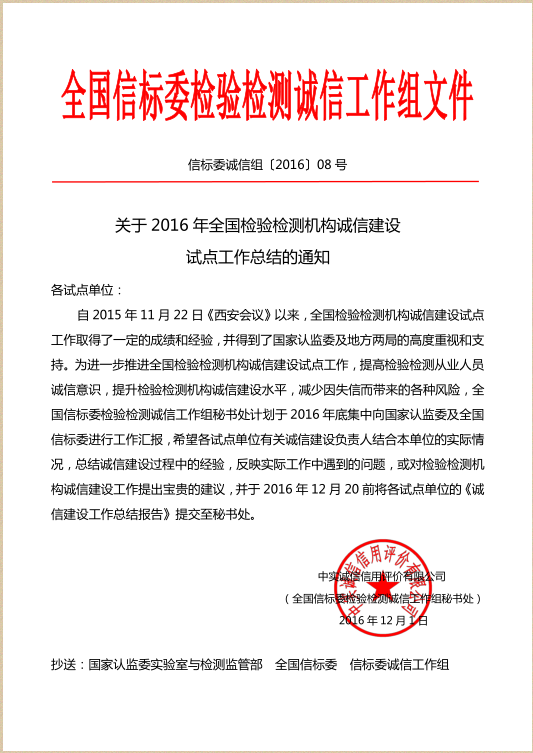10月27日,国家认监委在长沙发布检验检测行业首个诚信国家标准——《检验检测机构诚信基本要求》。该标准从法律要求、技术要求、管理要求、责任要求等四个方面,规定了检验检测机构应当遵循的基本诚信规范,为检验检测机构推进诚信建设、防范失信风险、提升社会信任、树立品牌形象提供了指引。